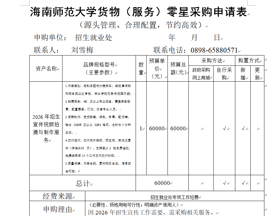 2026年招生宣传视频拍摄于制作服务采购申请表公示